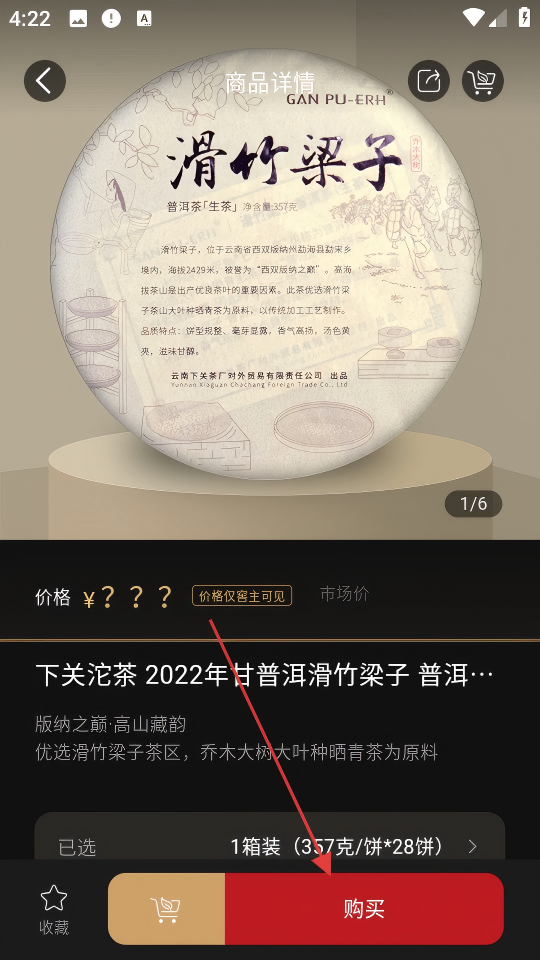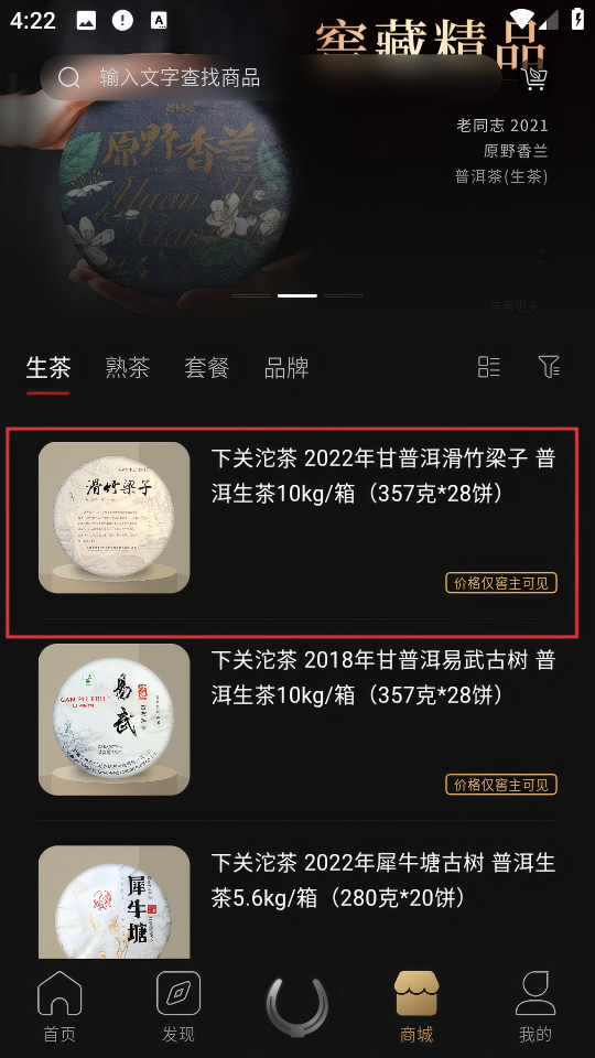 2、在商城中,选择要购买的茶品,如下关沱茶2022年甘普洱滑竹梁子普洱生茶。