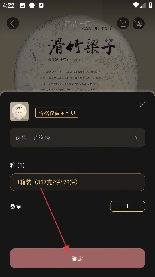 4、在弹出的购买窗口中,确认茶品规格和购买数量,然后点击【确定】,完成购买。