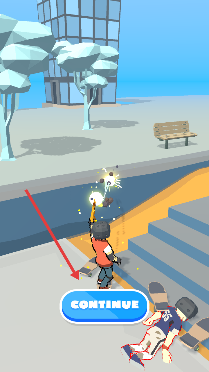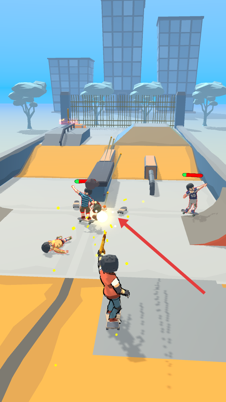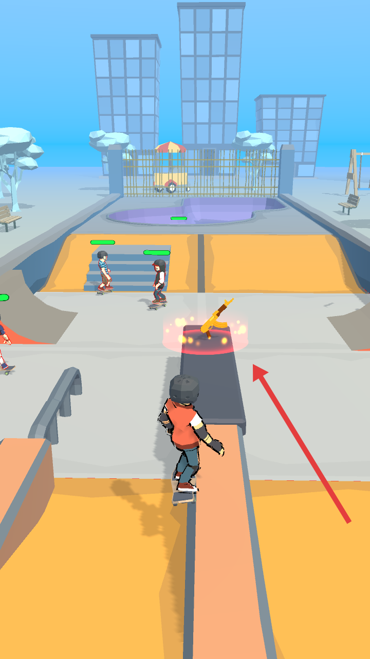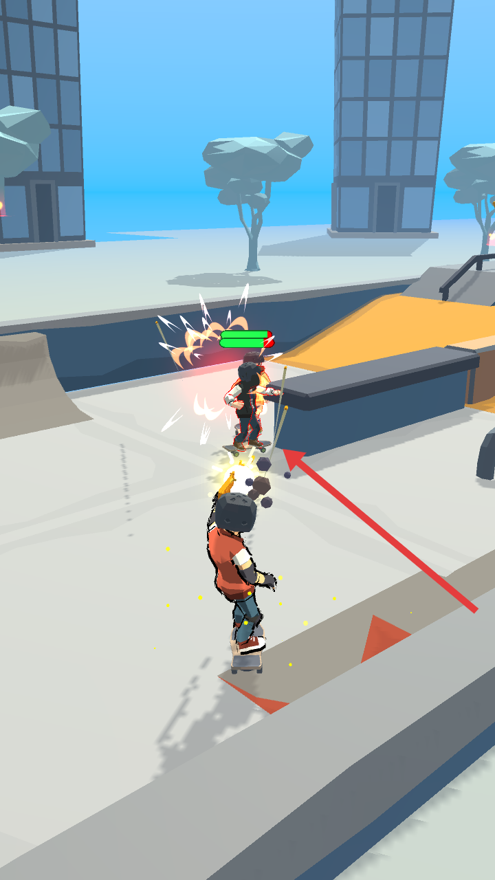 2、利用武器攻击其他滑板对手,注意躲避对方的攻击,逐步击败更多敌人。