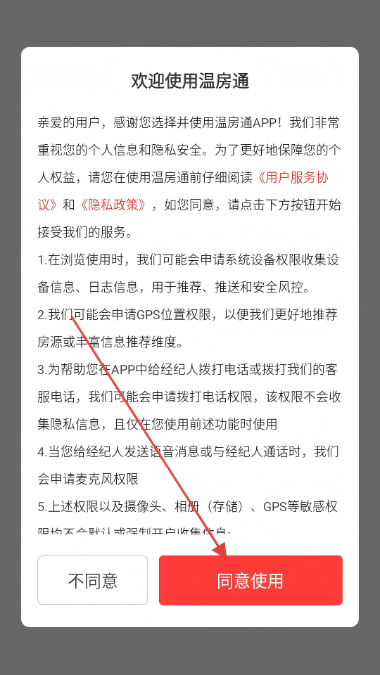 1、首次打开“温房通”APP,阅读并点击【同意使用】,同意《用户服务协议》和《隐私政策》。