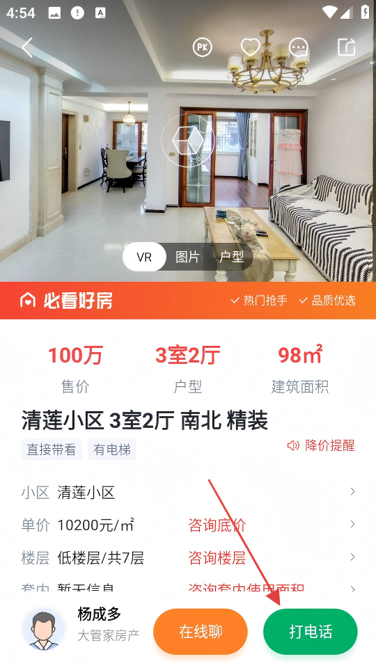 4、进入详情页,可查看VR、图片、户型等信息,点击【打电话】沟通。
