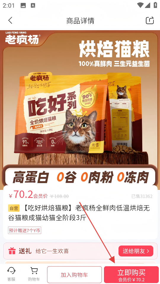 3、在【吃好烘焙猫粮】商品详情页,可查看商品详细信息,点击【立即购买】。