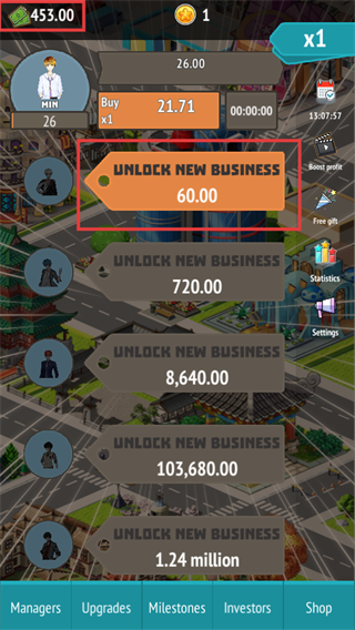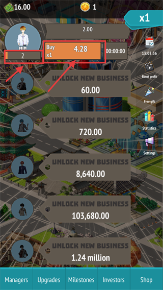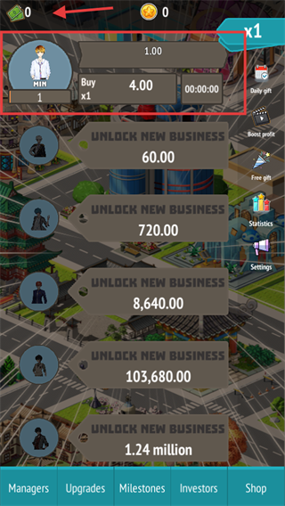 2、资金充足时点击【Buy-x1】提升【MIN】产出效率,加速资金积累以解锁新业务。