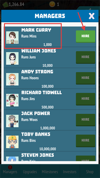 4、在【Managers】界面,资金够【1,000】时雇佣【MARK-CURRY】,自动管理【Mins】提升产出。