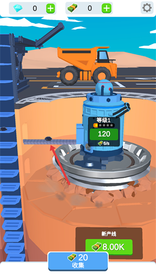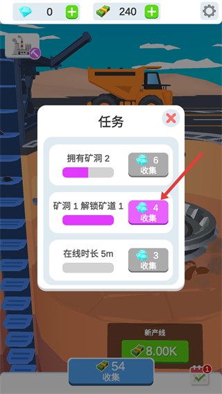 4、完成“矿洞1解锁矿道1”任务,点击【收集】按钮领取奖励,推进工厂发展。