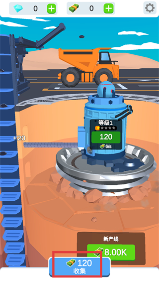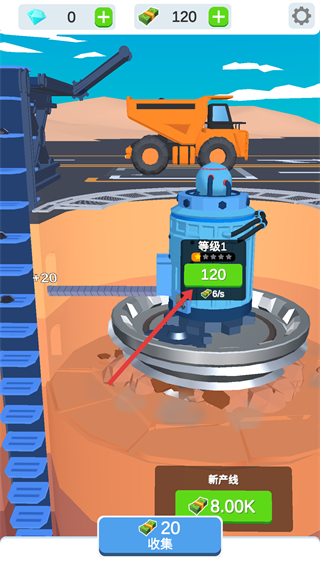 3、收集完钞票后,点击【120】进行升级机器人提升开采效率。