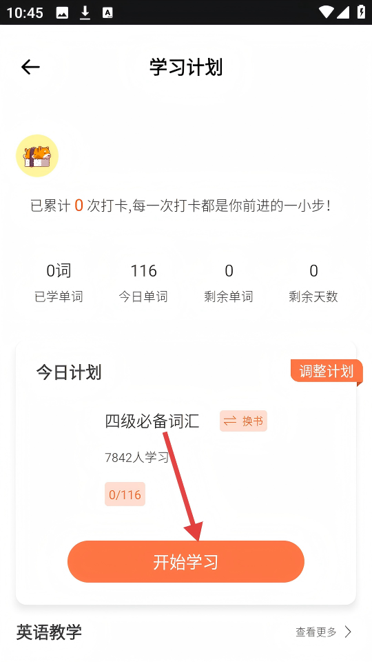 3、在学习计划页面,点击【开始学习】按钮,进入词汇学习页面。
