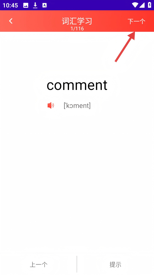 4、在词汇学习页面,学习完当前单词【comment】后,点击右上角【下一个】按钮,学习下一个单词。