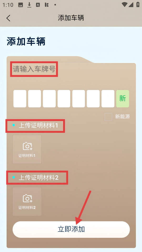 4、在添加车辆页面,输入车牌号,上传【证明材料1、证明材料2】后,点击【立即添加】按钮,完成车辆添加。