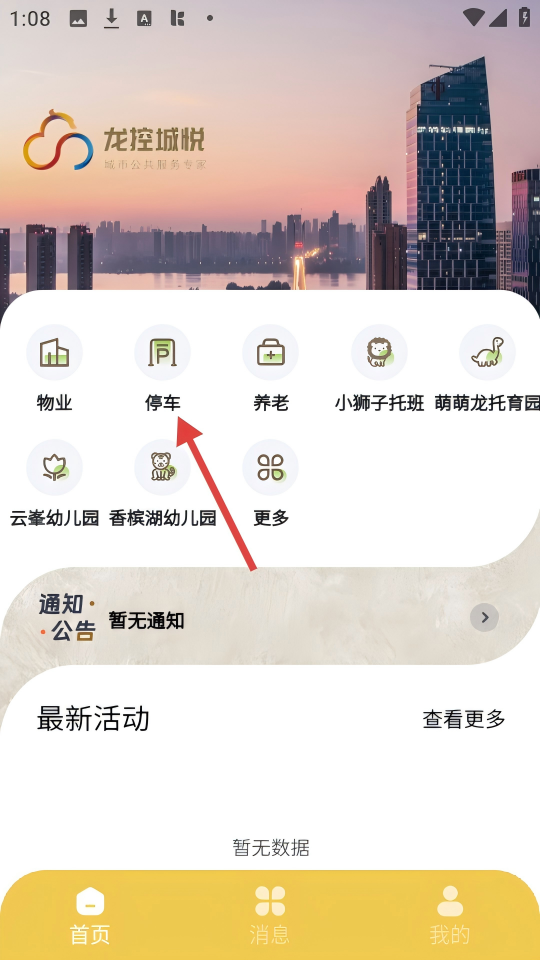 1、在龙控城悦首页,点击【停车】选项,进入停车页面。
