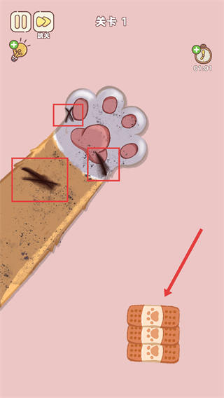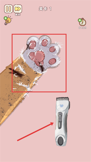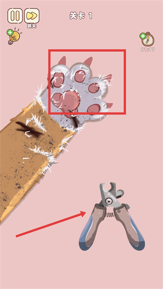 1、进入关卡1后,第一步,使用指甲钳修剪红色框内猫爪的指甲,完成指甲护理步骤。