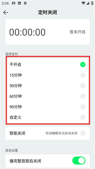 4、在QQ音乐定时关闭页,选择想要的时长即可完成定时设置啦。