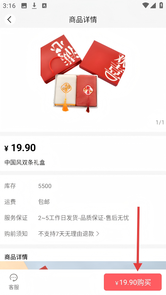 3、在【中国风双条礼盒】商品详情页,点击【¥19.90购买】按钮,可进入确认订单页面。