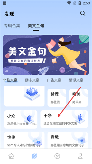 文案馆是一款为用户提供文案语录的工具,汇集海量文案句子,还对优质句子进行在线汇总,方便用户对短句美文一键摘录,能详细了解文案的出处与作者,在线体验各类文学好句,轻松筛选所需内容。平台支持用户建立专属文案合集,可品读专辑文案,实现优质文案阅读,助力汲取文案能量知识、保持积极生活方式。