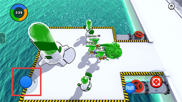 1、操控左侧【蓝色按钮】移动角色,利用喷射器染色区域,积累分数(当前【2:59】)。