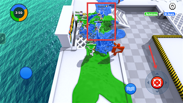 2、瞄准红框内的敌方区域,点击右侧【红色按钮】喷射颜料,覆盖敌方染色区域,争夺场景控制权。
