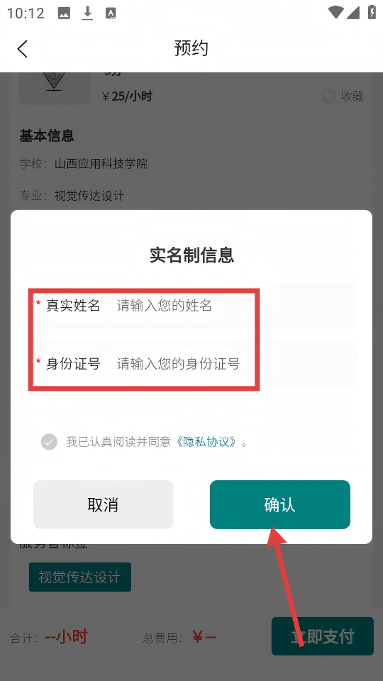 3、在【实名制信息】弹窗中,填写【真实姓名、身份证号】,勾选协议后,点击【确认】按钮。