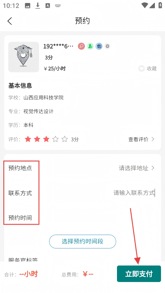 2、在【预约】页面,填写【预约地点】【联系方式】,选好预约时间段后,点击【立即支付】按钮。