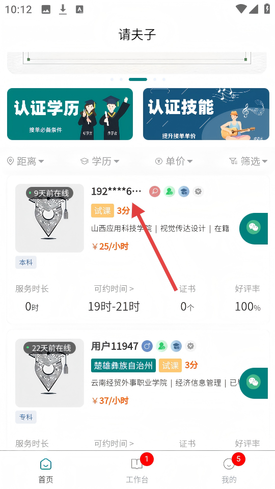 1、在【请夫子】页面,点击目标服务人员进入其详情页。