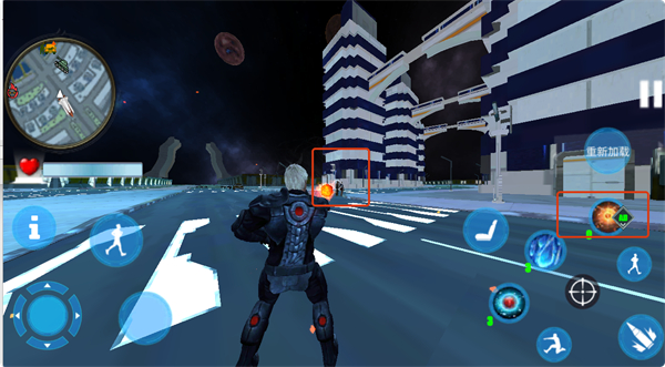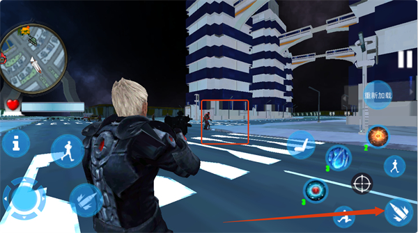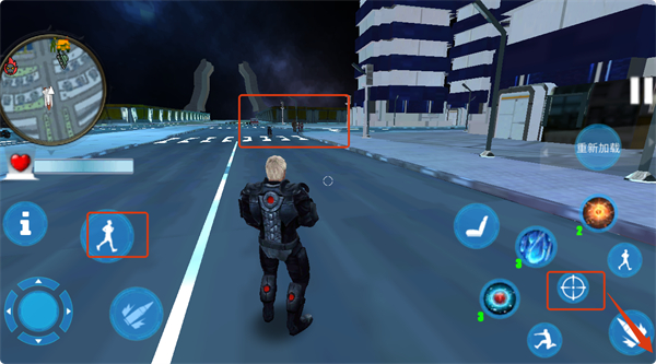 2、在城市场景中移动角色,点击跑步和瞄准按钮,接近敌人,熟悉战斗操作和界面功能。