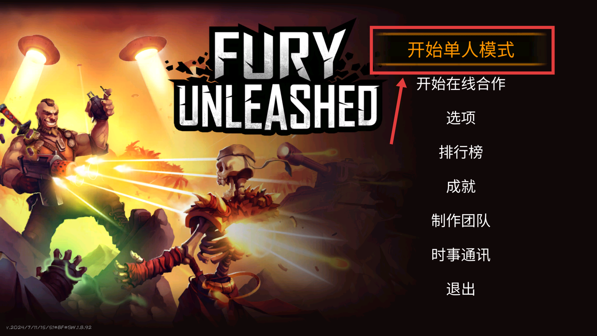 1、进入【FURYUNLEASHED】主界面,选择开始单人模式,开启轻度roguelike动作游戏的射击战斗之旅。