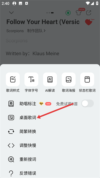 3、在歌词设置中选择【桌面歌词】,触发开启提示哦。