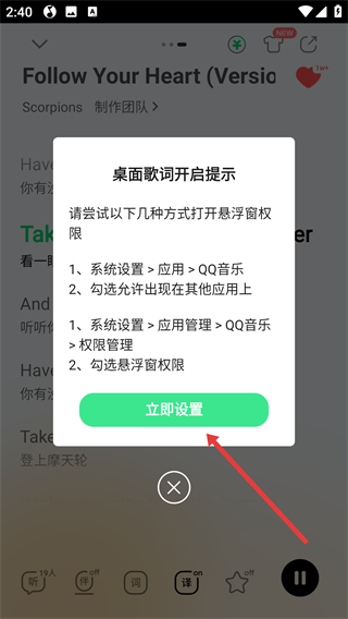 4、在提示弹窗里点击【立即设置】,开启悬浮窗权限啦,之后就可以开启桌面歌词咯。