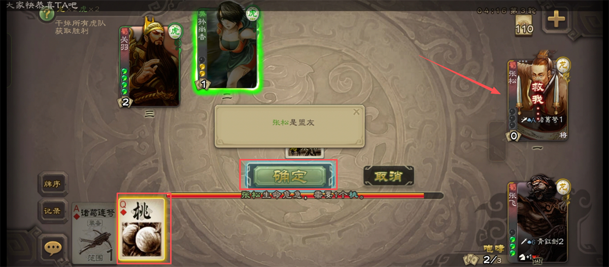 1、盟友张松生命危急时,使用【桃】并点击【确定】,及时救援盟友以维持团队战力。