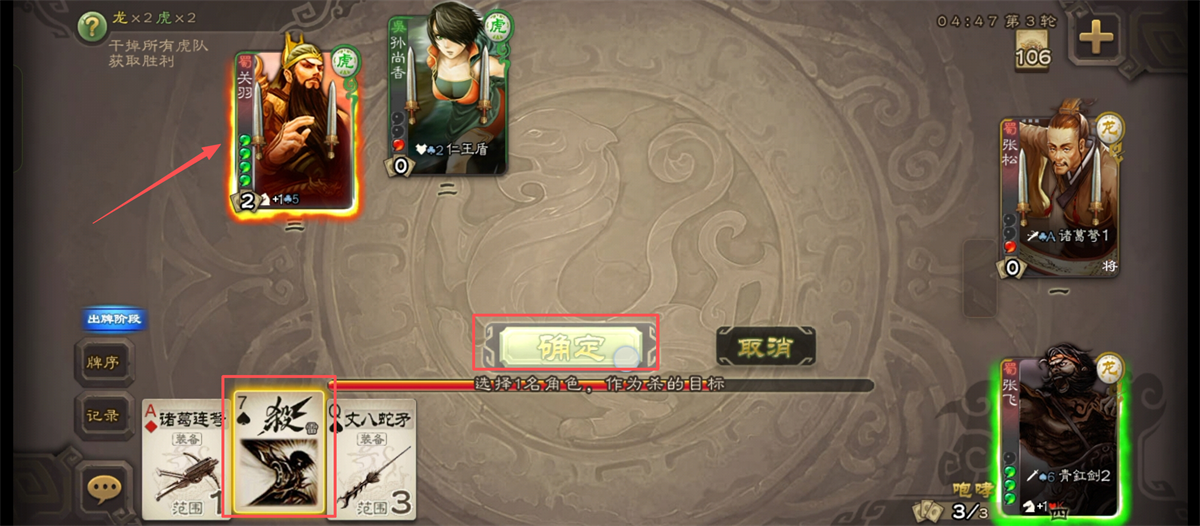2、出牌阶段选择【杀】,瞄准敌方关羽作为目标,点击【确定】发起攻击,消耗敌方生命值。