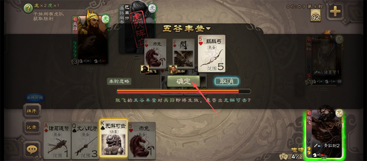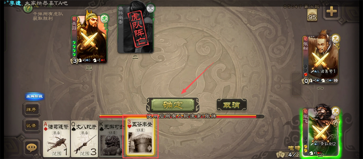 3、使用锦囊【五谷丰登】后点击【确定】,让所有人轮流摸牌,以此扩大己方手牌优势。