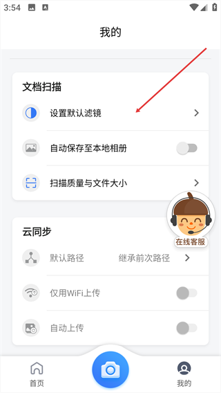 2、进入【我的】页面,找到并点击【设置默认滤镜】选项。
