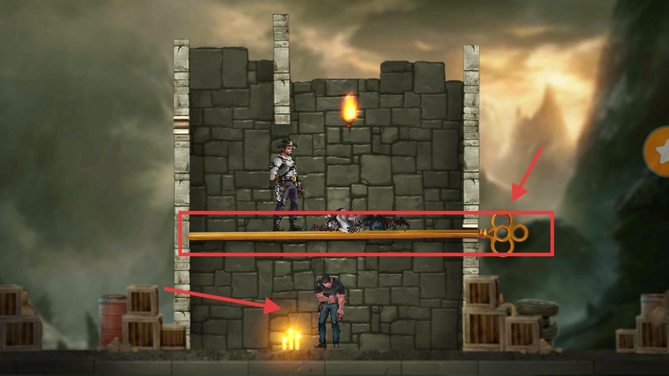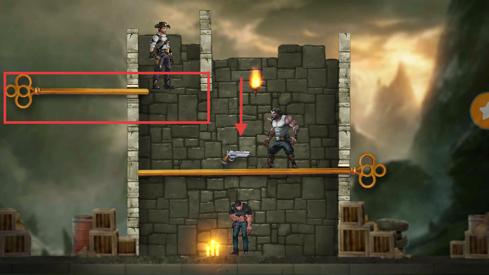 1、角色可移动至下方钥匙平台,获取【手枪】武器,借助武器击败中间敌人,推进关卡进程。