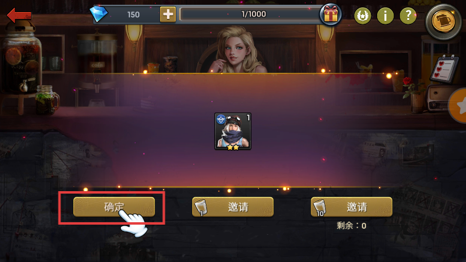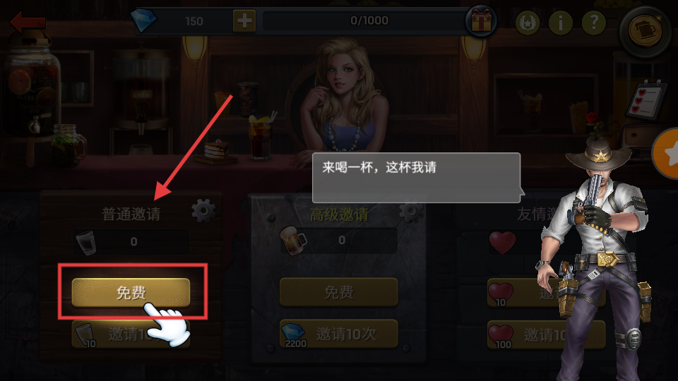 3、酒馆界面中,点击【普通邀请】下的【免费】按钮,可免费招募英雄,积累角色资源提升战力。