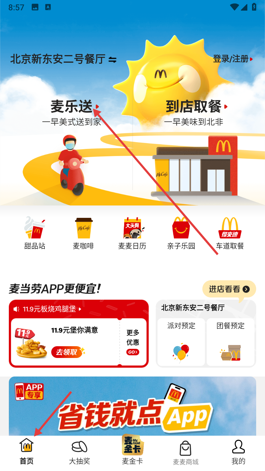 2、点底部【首页】,选【麦乐送】,开启外卖点餐