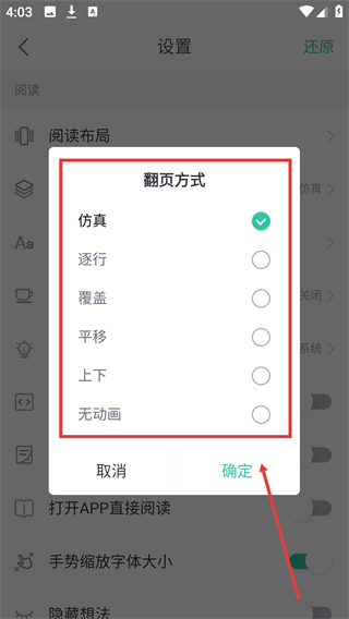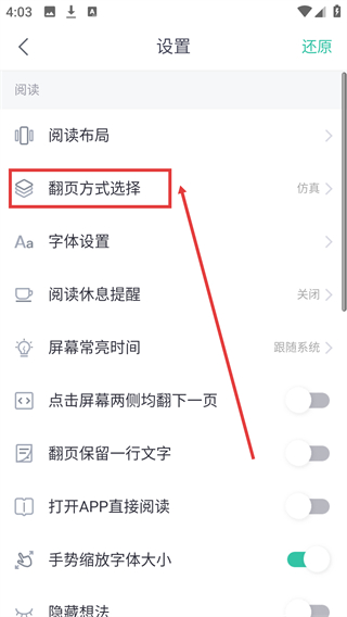 3、进入【设置】页后,找到【翻页方式选择】选项,点击进入翻页方式的选择弹窗。