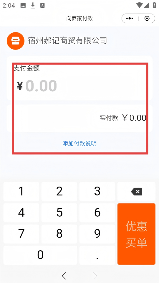 4、在向商家付款页面输入支付金额,可添加付款说明后进行支付。