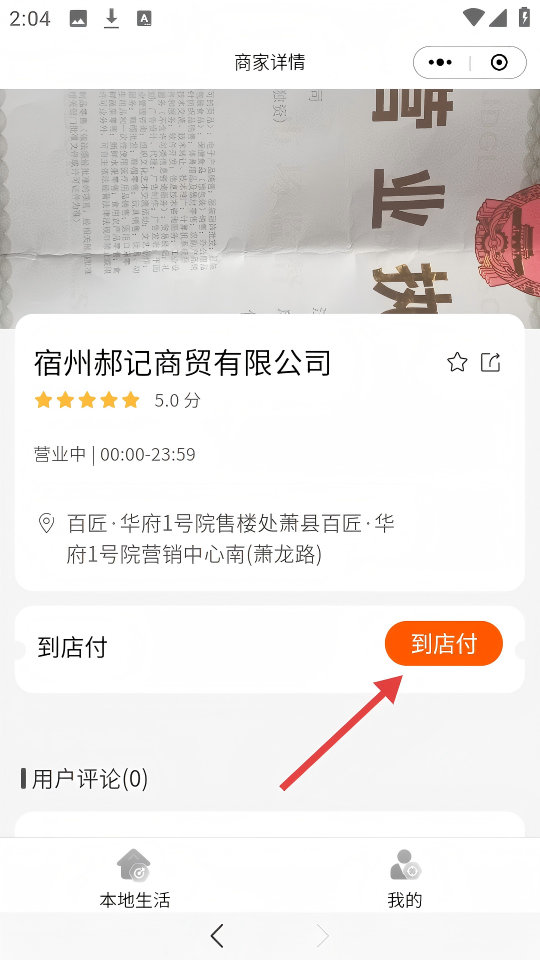 3、在商家详情页点击【到店付】按钮,进入向商家付款页面。