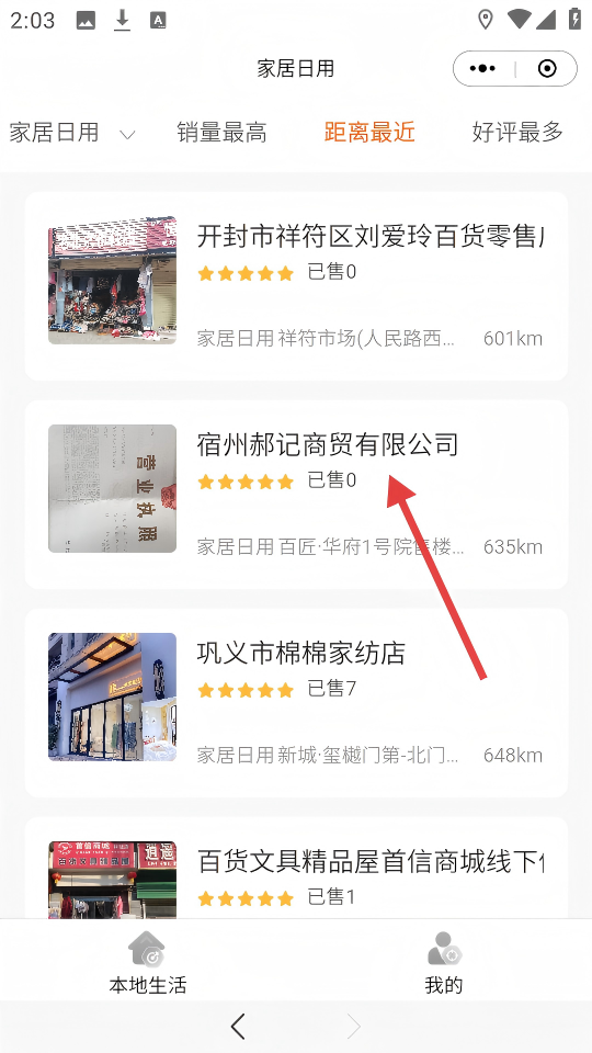 2、在家具日用商家列表中点击【宿州郝记商贸有限公司】,进入该商家详情页。