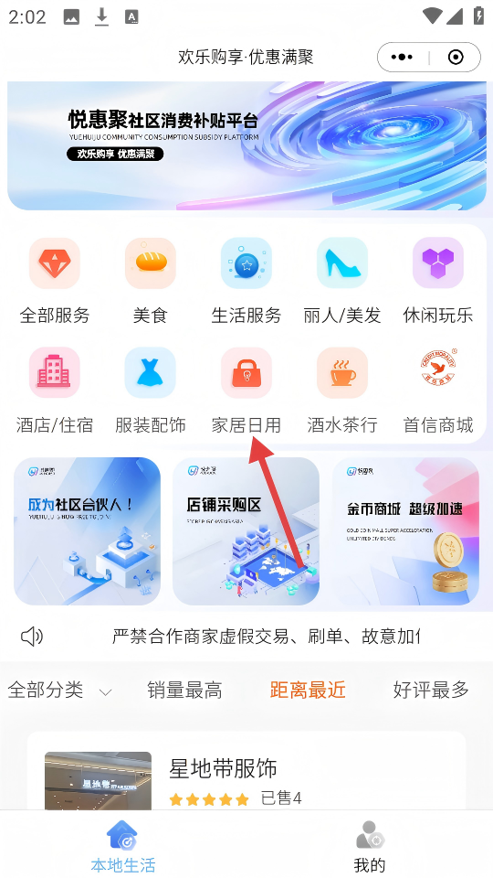 1、在首页点击【家居日用】图标,进入家居日用商家列表页面。