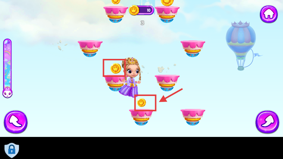 3、引导公主跳至带金币的蛋糕平台,精准移动获取更多金币。