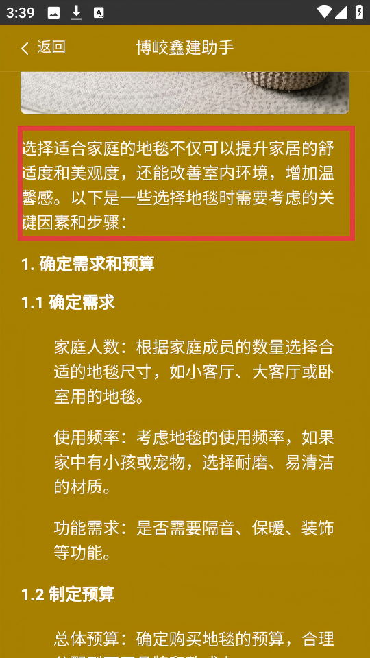 4、查看【选择适合家庭的地毯不仅可以提升家居的舒适度和美观度...】等内容,了解选地毯的要点。
