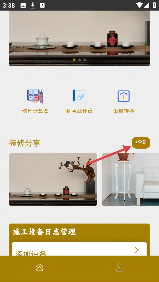 2、在首页,点击【装修分享】右侧的【+全部】按钮,查看更多装修分享内容。