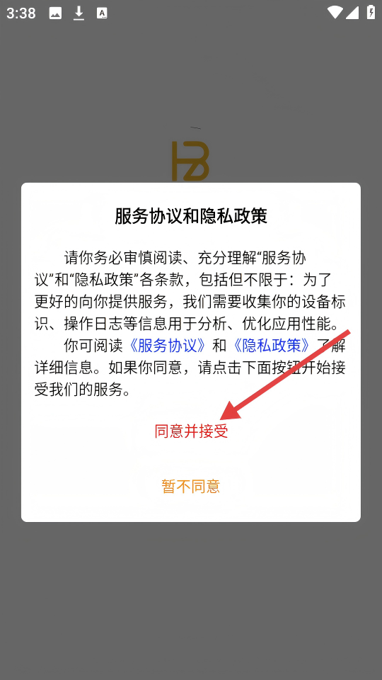 1、阅读服务协议和隐私政策后,点击【同意并接受】按钮。