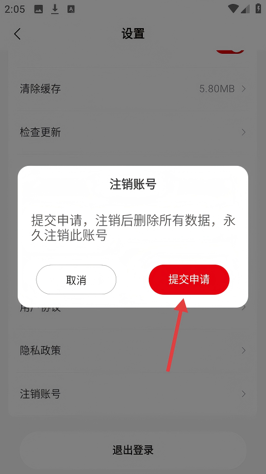 4、在注销账号的提示框中,点击【提交申请】,提交账号注销申请。