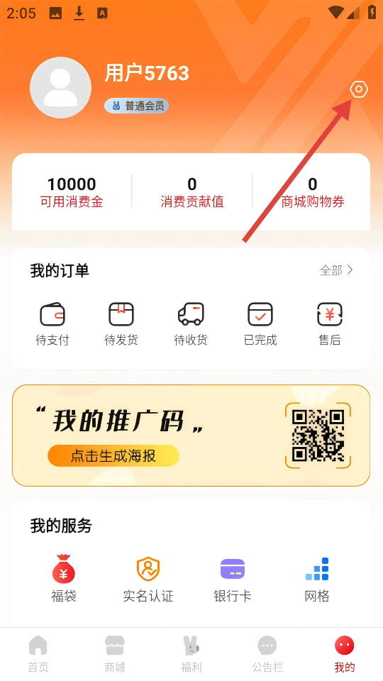 2、在我的页面,点击右上角的设置图标,进入设置界面。