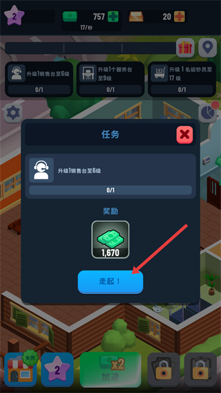 2、在任务界面,点击蓝色【走起!】按钮,开始完成升级销售台等任务,完成后可获得金币奖励。