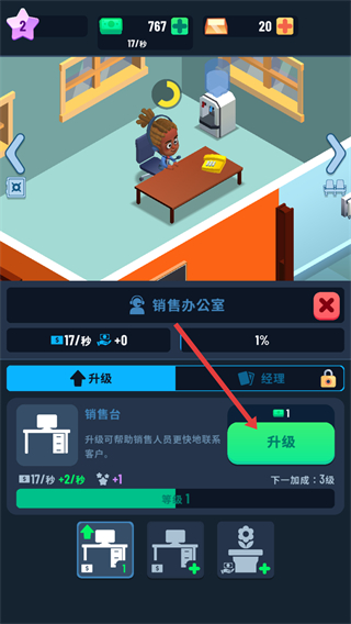 3、进入销售办公室界面,点击绿色【升级】按钮,升级销售台,提升销售人员的赚钱效率。