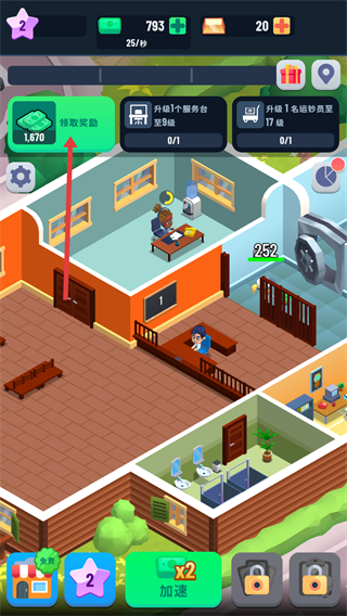 4、完成任务后,点击红色箭头指向的【领取奖励】按钮,获取金币奖励,用于进一步升级银行设施。