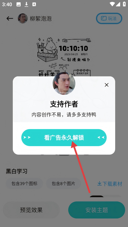 4、在【黑白学习】主题弹窗中,选择【看广告永久解锁】即可使用该主题。