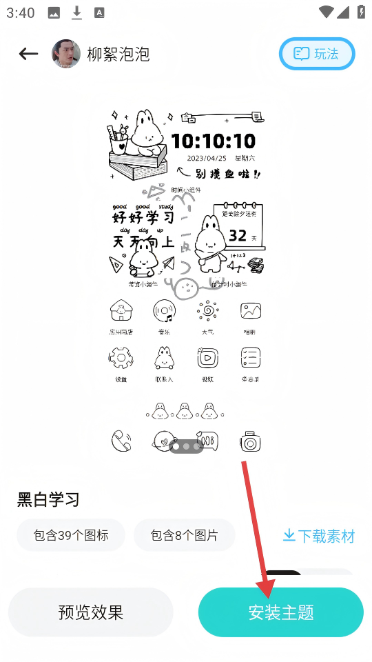3、在【黑白学习】主题页,点击右下角【安装主题】进行使用。